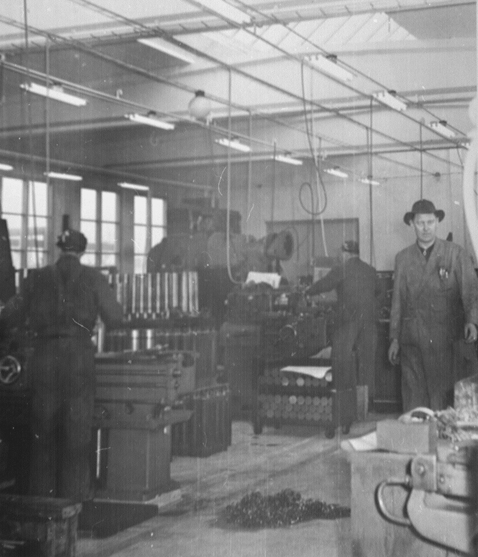 När efterfrågan på bilar sjönk under kriget började Sörlings tillverka svarvar istället. Här står fyra arbetare och en svarv på Sörlings gård.