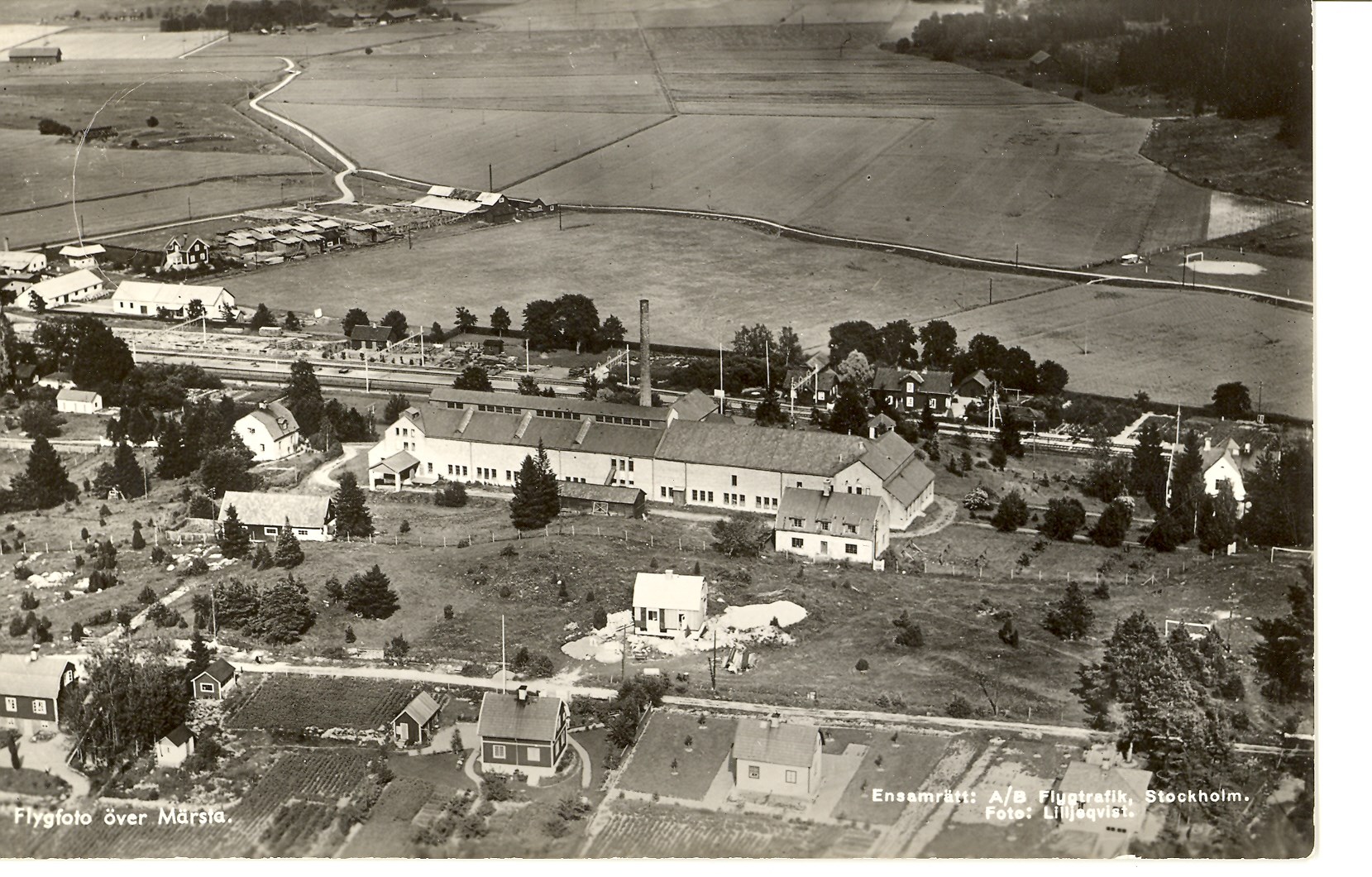 Närmast järnvägen mitt ligger Märsta såg och längre bort färgfabrikens olika byggnader. Foto från 1949.