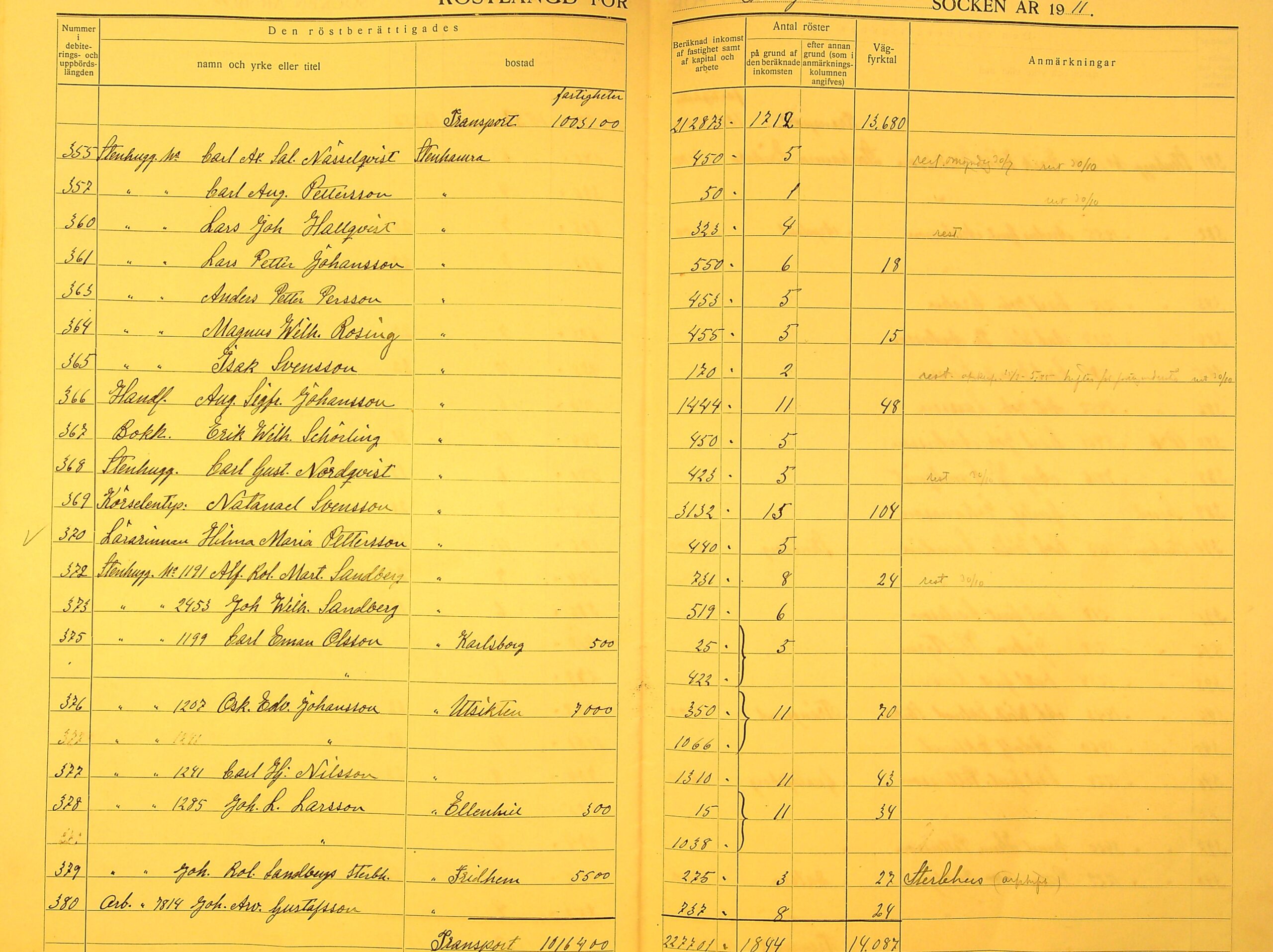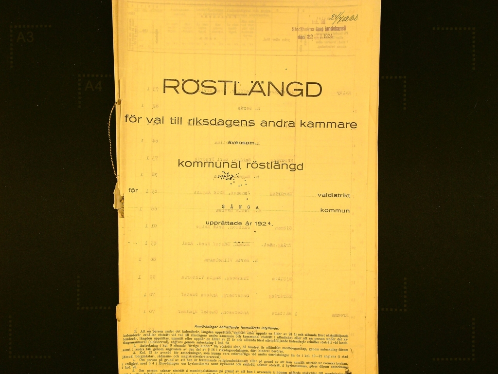 1911 är det kommunval i Sånga på Färingsö. I röstlängden står namnen på alla personer, företag och organisationer som har rösträtt i valet. Det står också vad personerna har för yrke, hur mycket de tjänar och hur många röster de har. Man får nämligen fler röster ju rikare man är. Stockholms stad till exempel, har 19 röster enligt röstlängden. Fru Eliasson däremot, hon har bara 2 röster. Låter det osannolikt? Så här hänger det ihop: