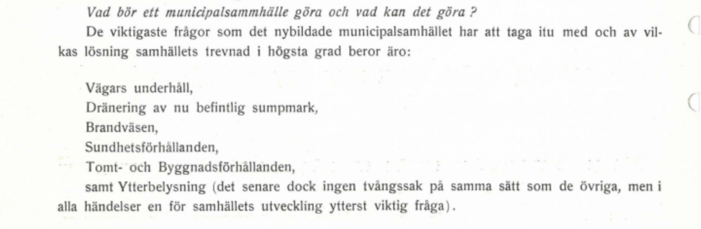 Fastighetsägarna i Täby vill bilda ett municipalsamhälle. Det var en sorts kommun i kommunen som fanns före 1971 och som bildades på platser med en tät befolkning som ändå inte riktigt var städer. Det var fiskebyar, bruksorter och ofta stationssamhällen. Om Täby skulle bli ett municipalsamhälle så skulle de kunna ta upp skatt och bestämma mer över ortens utveckling. Här kan du läsa ett utdrag ur skriften där villaägarna listar vad de vill använda skatterna till.