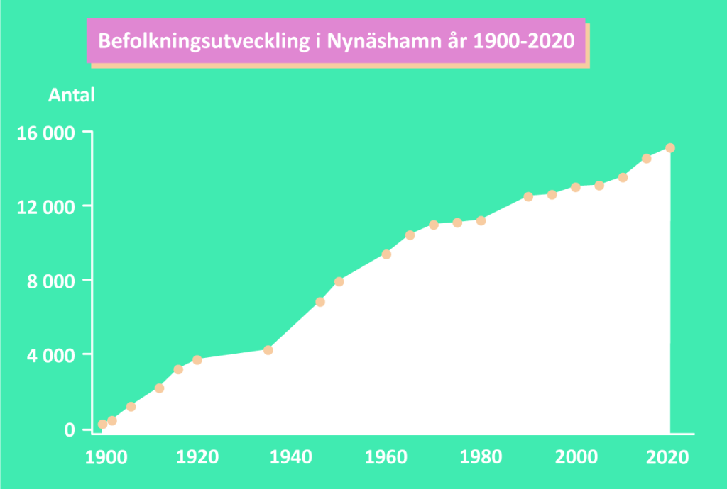 I diagrammet här nedanför så ser du hur Nynäshamns befolkning har växt under åren. Innan det fanns maskiner, löpande band och datorer behövdes det massor av människor för att tillverka saker. Industrierna i Nynäshamn behövde folk som arbetade. Därför flyttade folk dit för att få ett jobb.