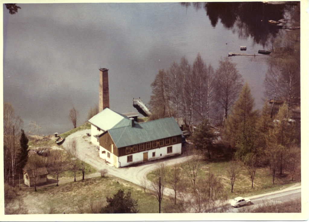 Svartvitt fotografi, stort trähus, i bakgrunden vy över vatten.