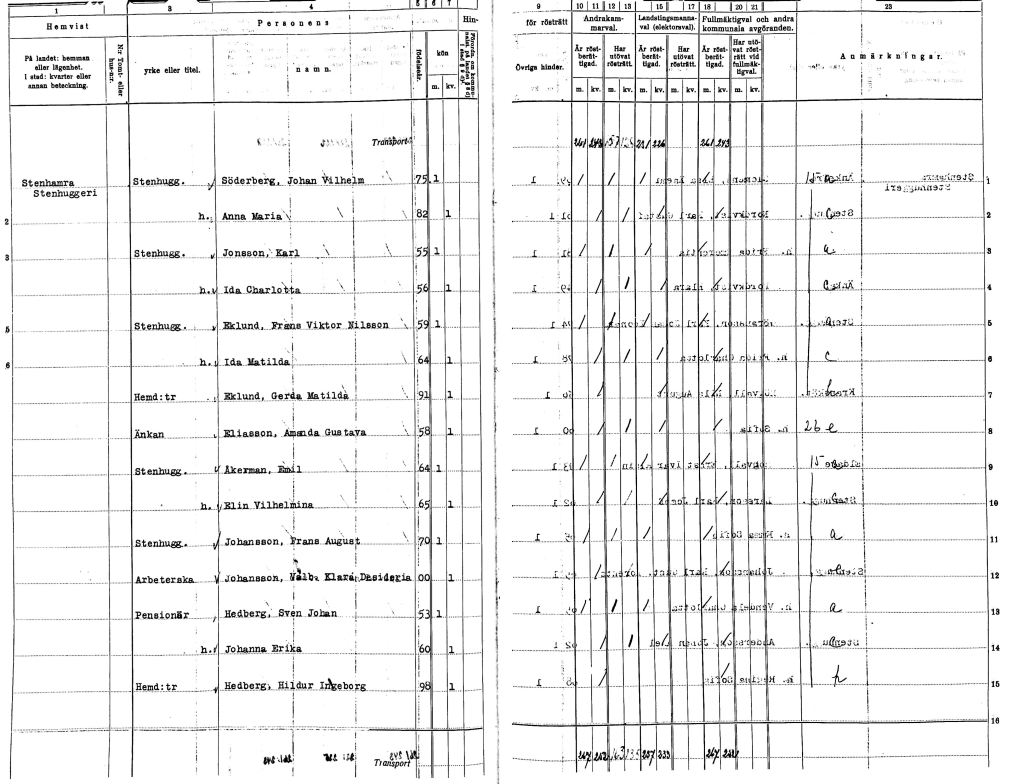 1911 är det kommunval i Sånga på Färingsö. I röstlängden står namnen på alla personer, företag och organisationer som har rösträtt i valet. Det står också vad personerna har för yrke, hur mycket de tjänar och hur många röster de har. Man får nämligen fler röster ju rikare man är. Stockholms stad till exempel, har 19 röster enligt röstlängden. Fru Eliasson däremot, hon har bara 2 röster. Låter det osannolikt? Så här hänger det ihop: